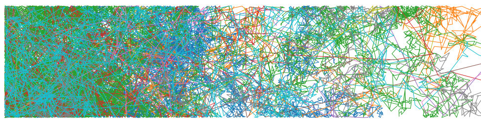After the simulation, we can see the output files in the Results folder. For example, phonon paths in such a structure showing mostly diffusive behavior: