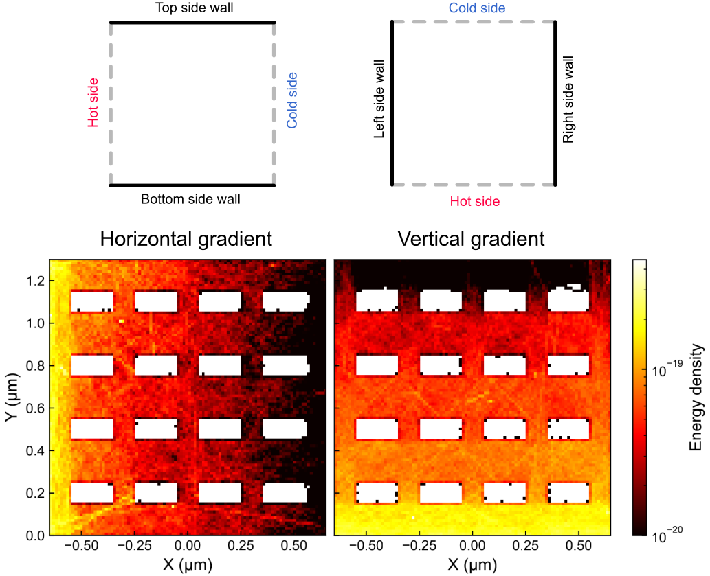 Thus, to create the horizontal thermal gradient, side walls should be rearranged, distribution changed and cold/hot side positions changed accordingly. For example, as follows (these lines are commented in the `anisotroopy_study.py` file):